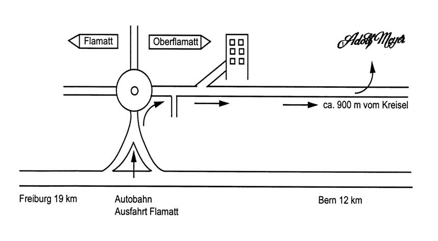 Fahren Sie bei der Ausfahrt Flamatt bis zum Kreisel, hier nach Oberflamatt nicht nach Flamatt, nach 900m sind Sie bei uns.